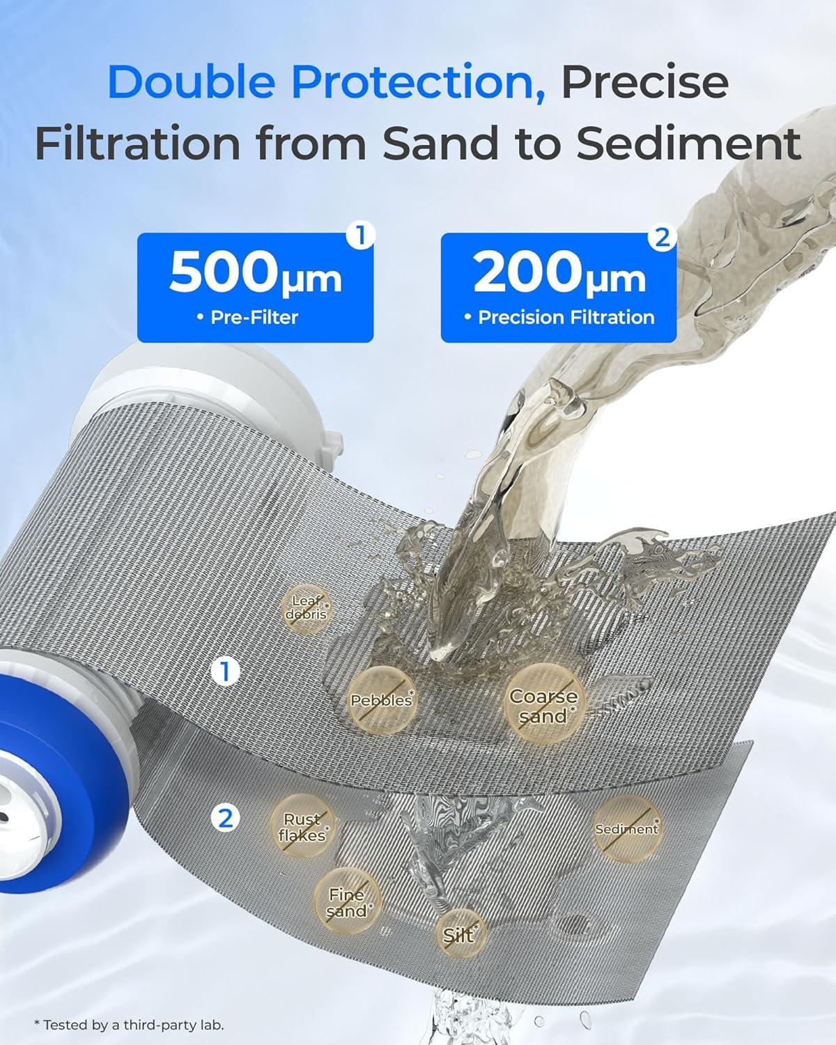【2-in1 Composite Design】 Experience the innovative composite whole house water filter with our 2-in-1 solution, expertly combining a pre-filter and whole-house system to reduce sediment, rust, dirt, sand, silt, large particulates with high efficiency.